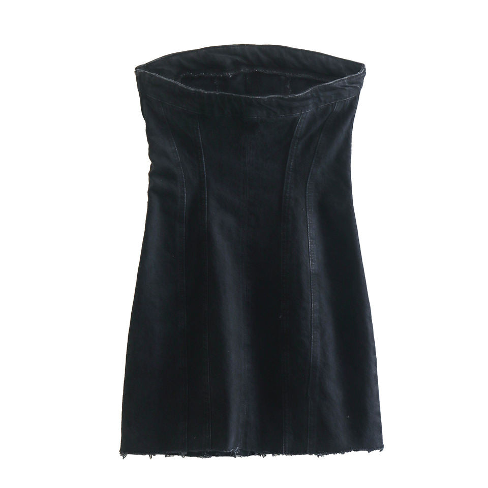 Black denim Strapless Sheath Mini Dress, for a confident chic sense of style, Slightly stretchy cotton-blend denim features strapless straight neckline and an exposed silver side zipper. This mini bodycon silhouette features seam detailing to complement the design.