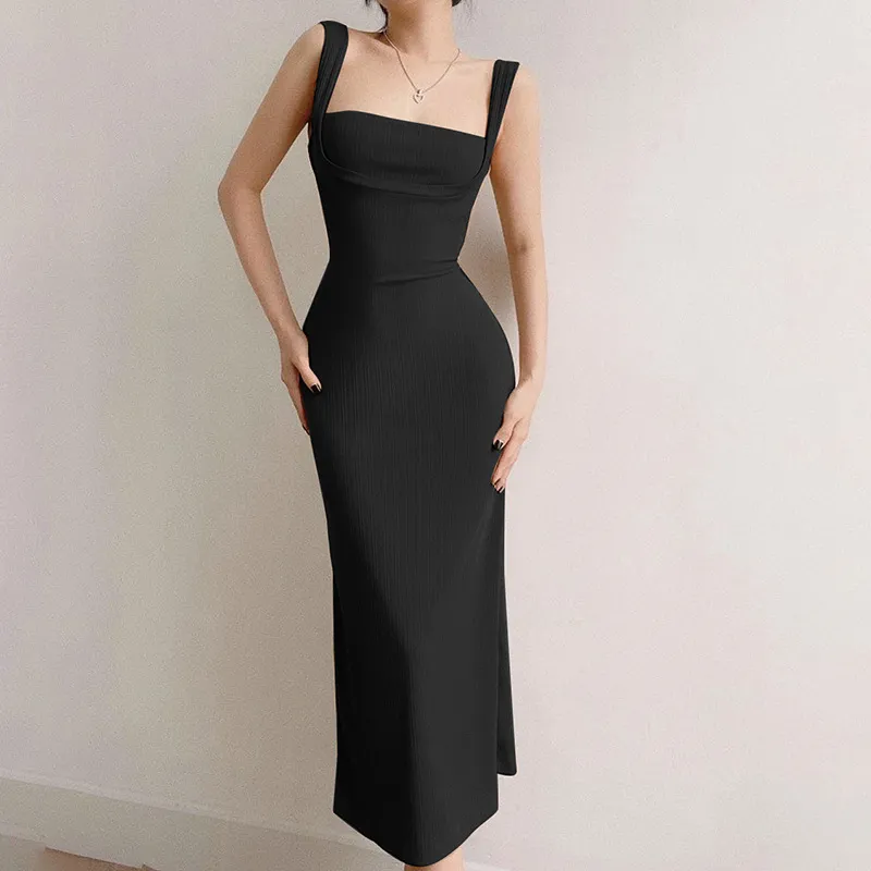 Black Square Neck Back Strap Midi Dress