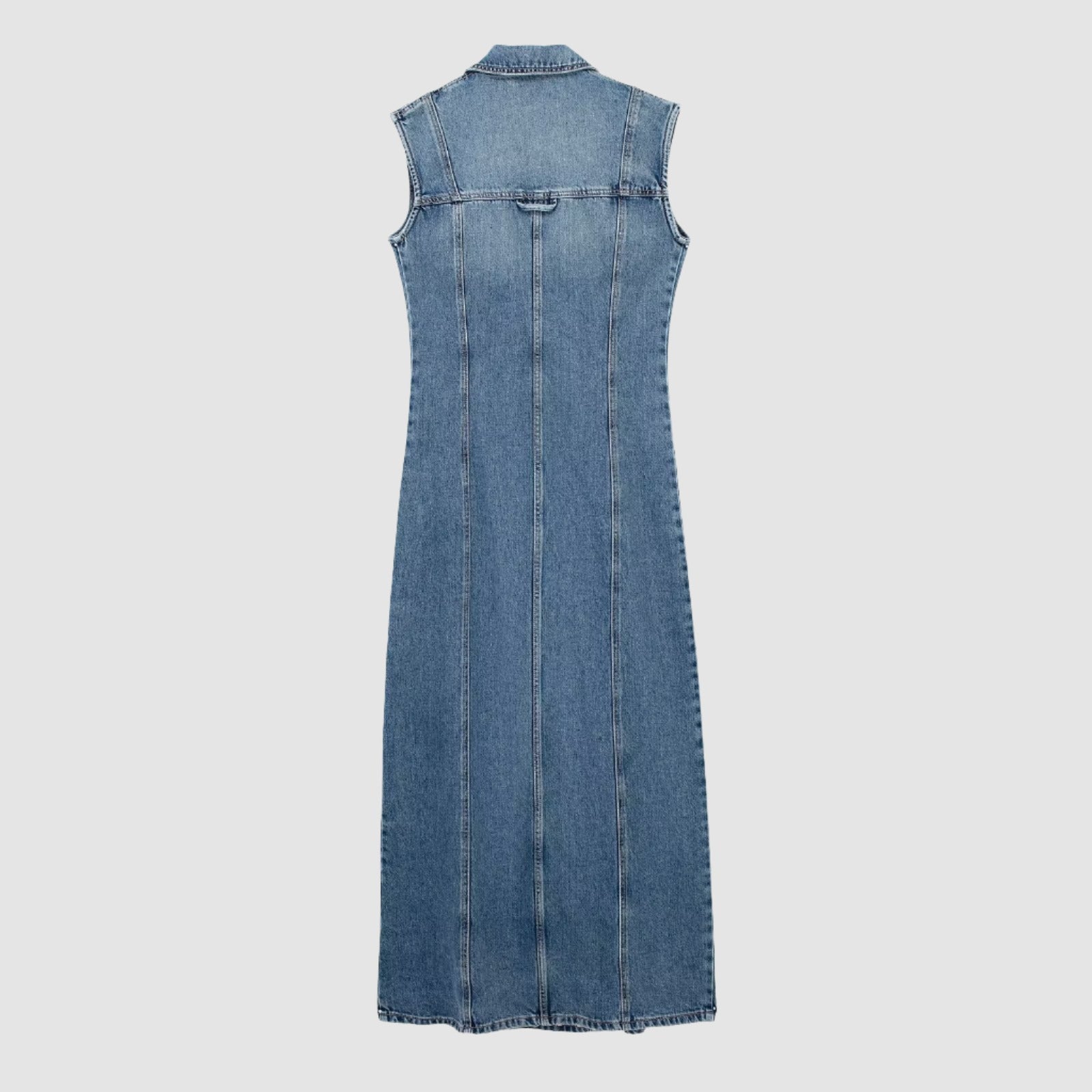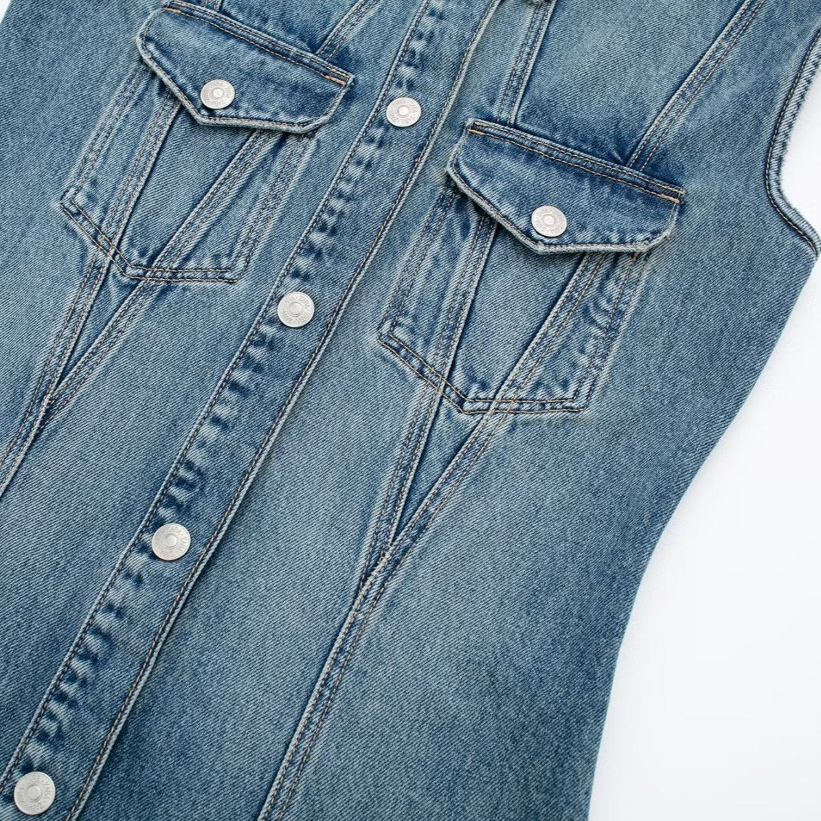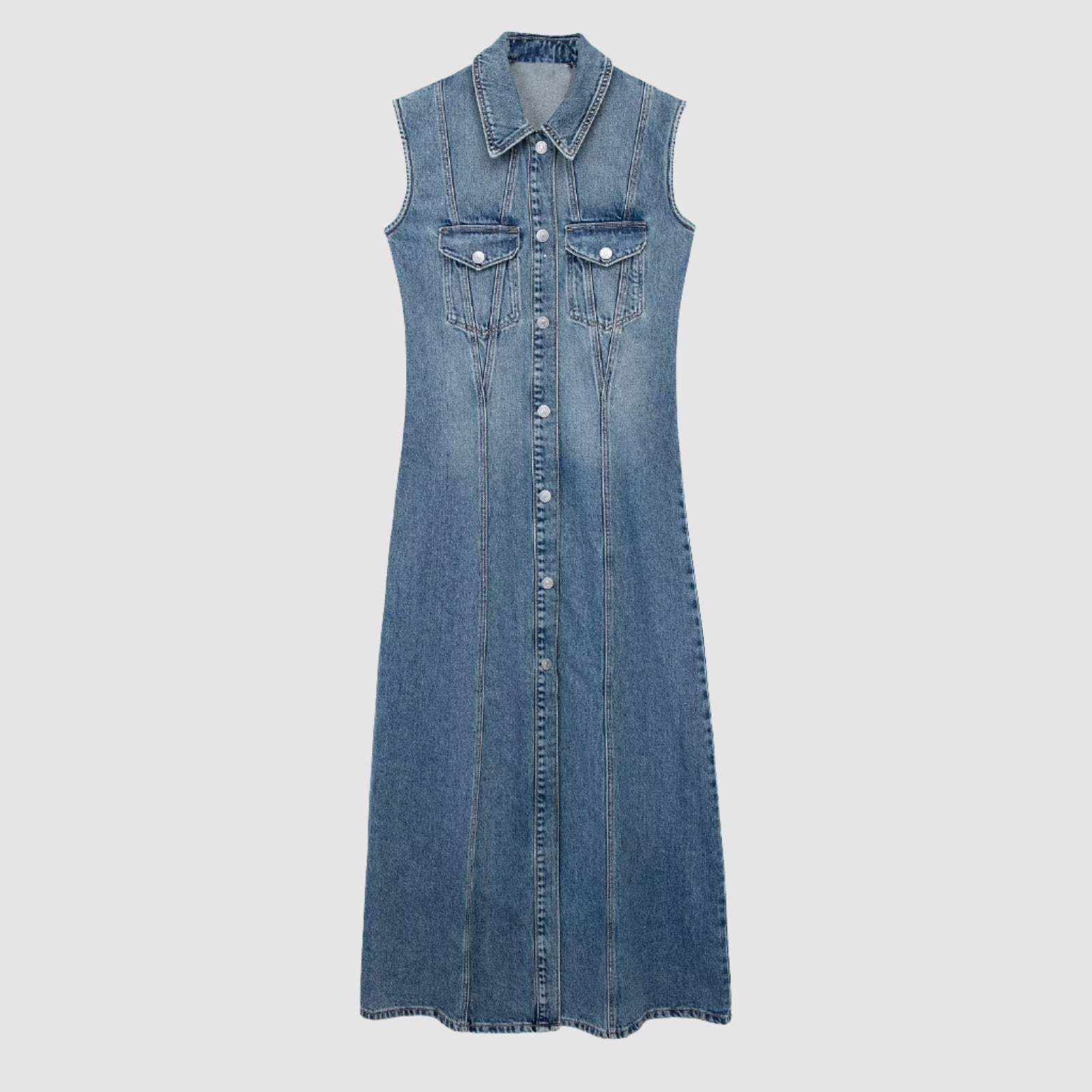Introducing our versatile long-sleeveless denim dress, featuring a button-up front, two stylish breast pockets, and a classic collar.