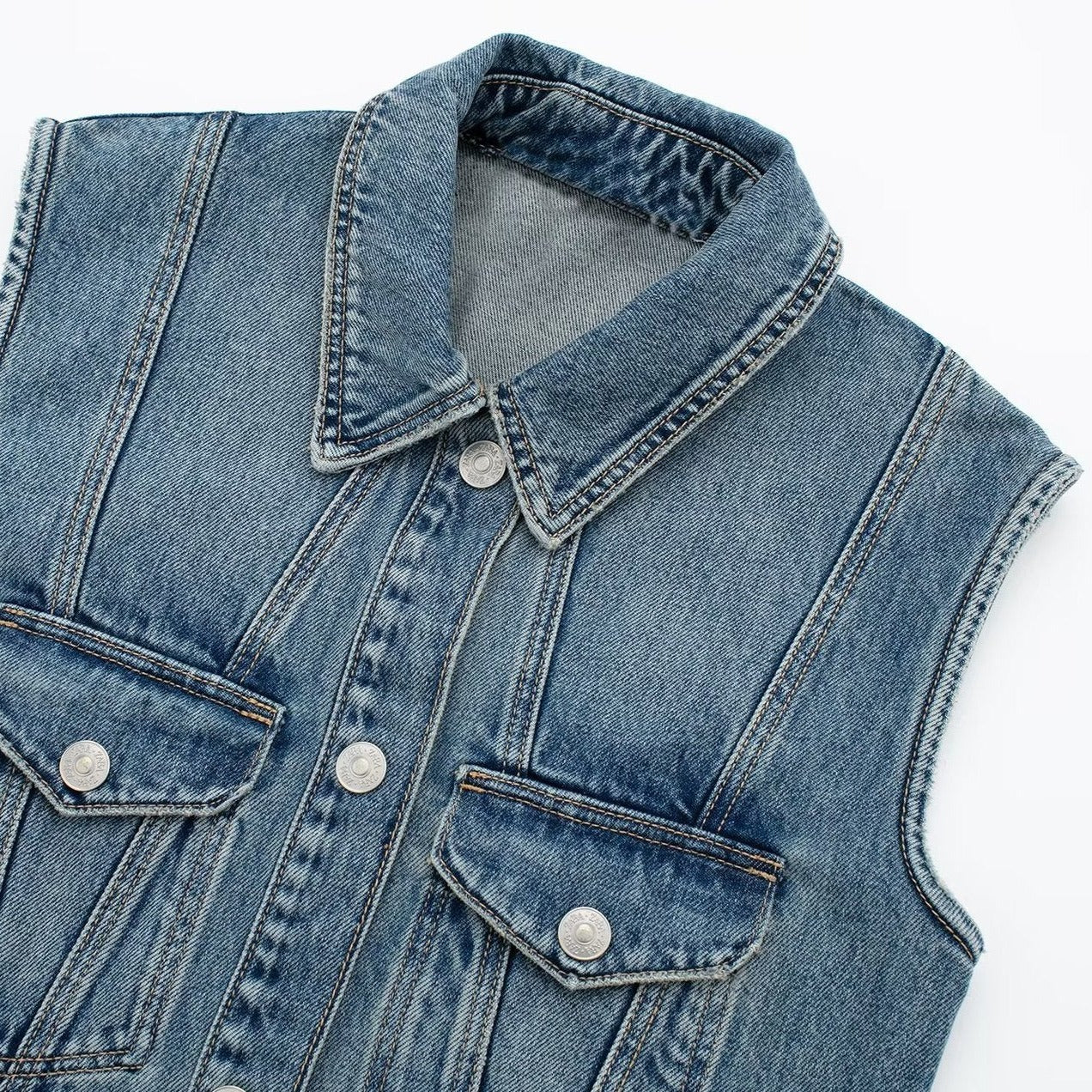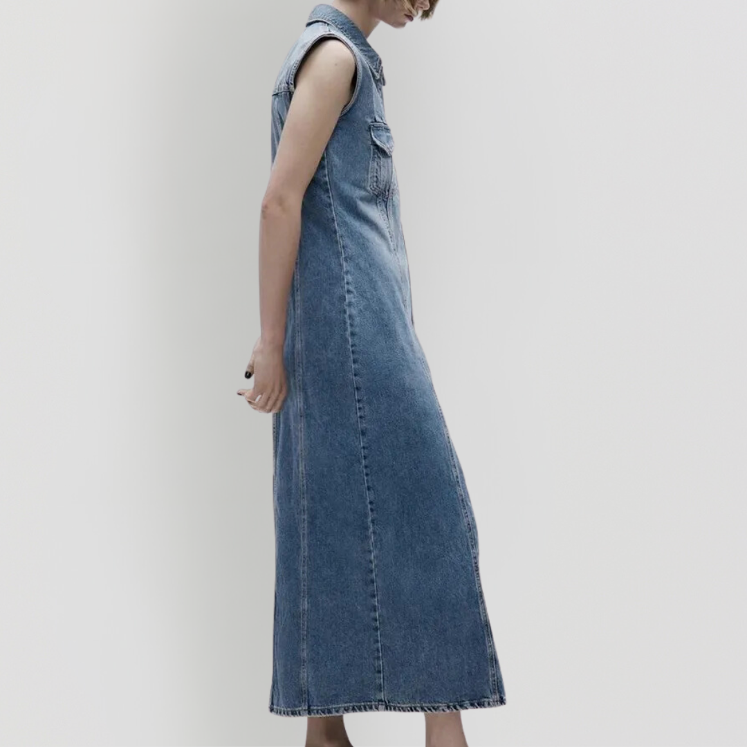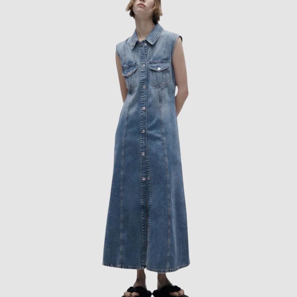 Introducing our versatile long-sleeveless denim dress, featuring a button-up front, two stylish breast pockets, and a classic collar.