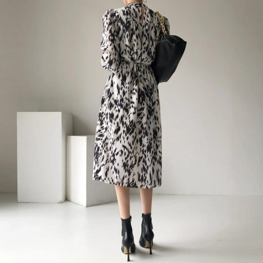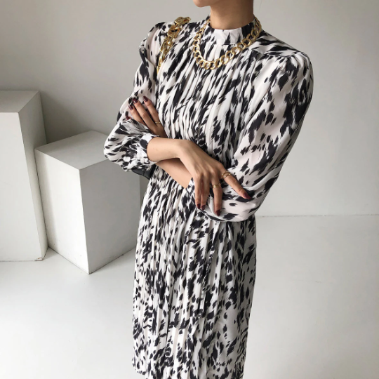 The dress features Shoulder pads, Frill sleeves, Smock style, and an oversized fit