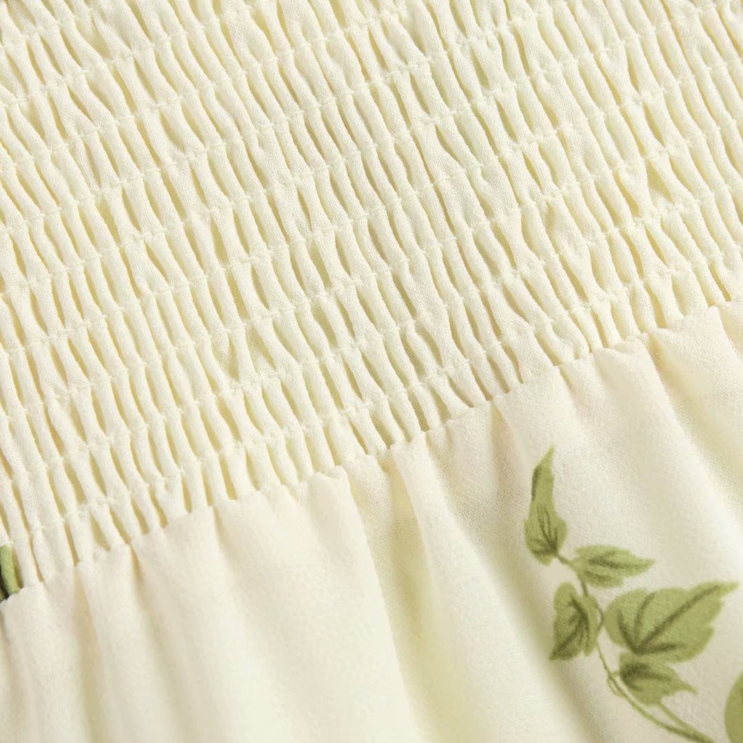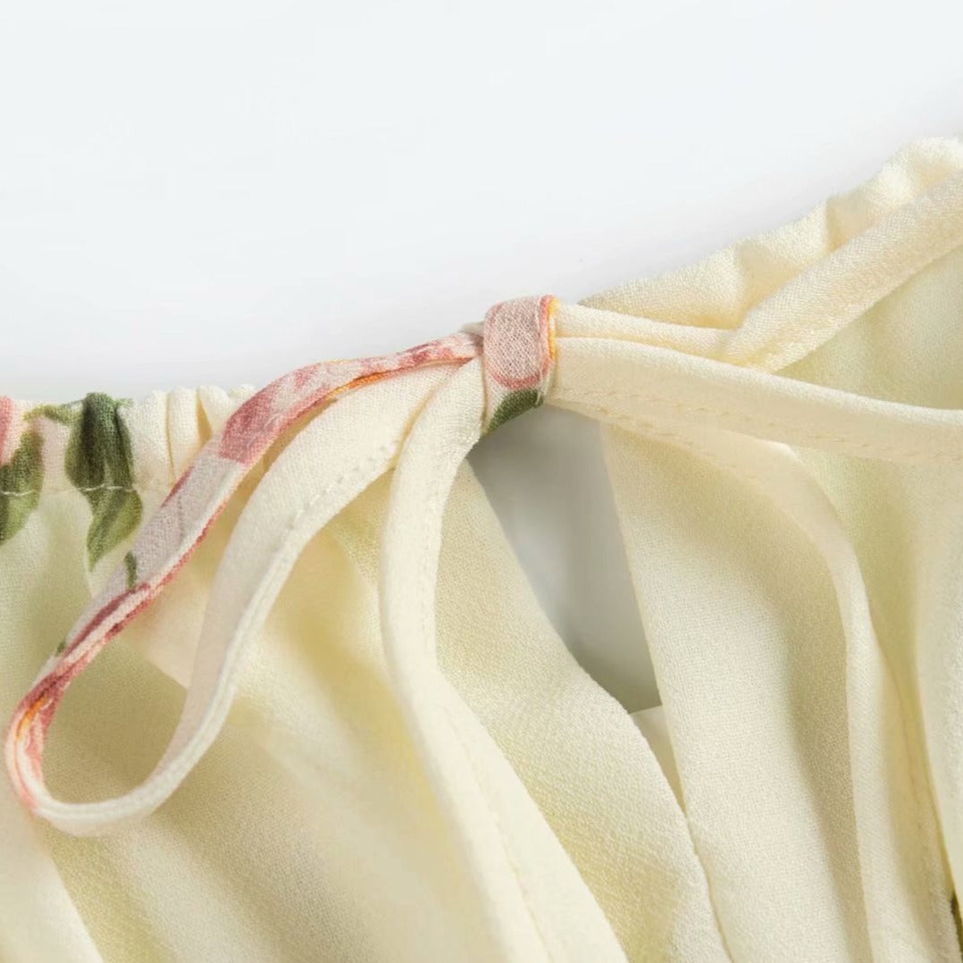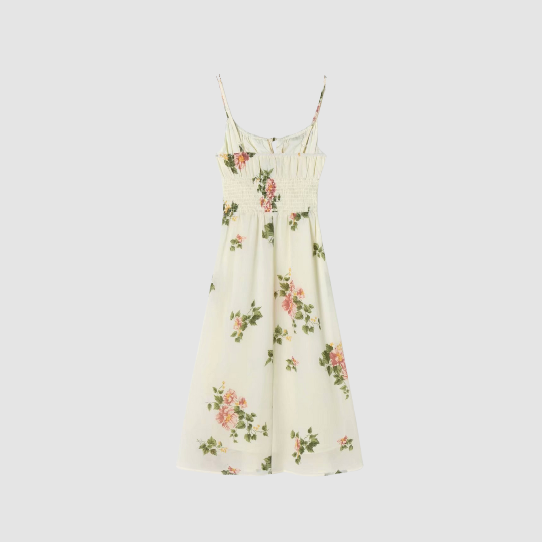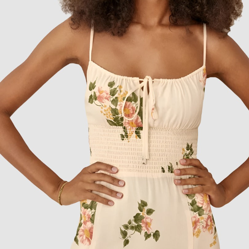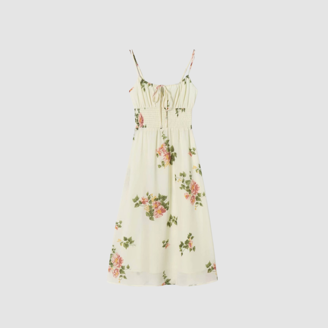 This dress screams summer. It features a lightweight and flowy material patterned with a floral print, a square neckline with a front tie and spaghetti straps, and a flattering silhouette that hugs your waist in all the right places with its stretchy bodice!