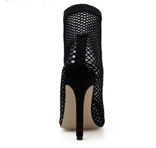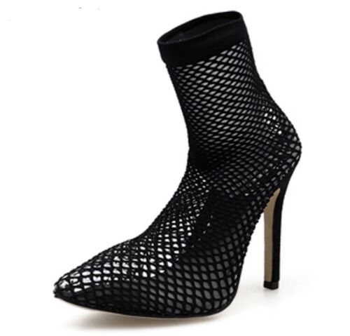 Fishnet Stiletto Ankle Bootie is made from a mesh upper, a lower calf-height shaft, a pointed toe silhouette, an inner pump, and a stiletto heel.