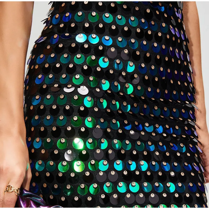This green sequin-embellished dress is a show-stopper. Featuring white and silver sequin embellishment, layered details, spaghetti straps, square neck, rear slit, hidden rear zip fastening, and mid-length.