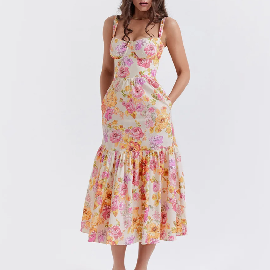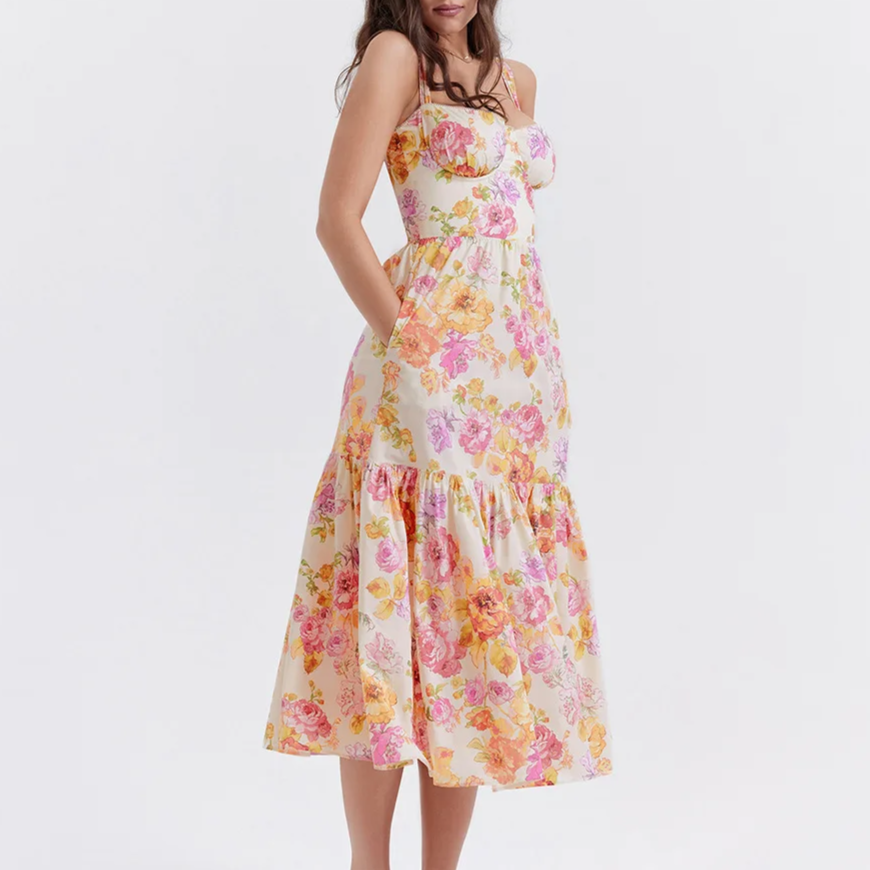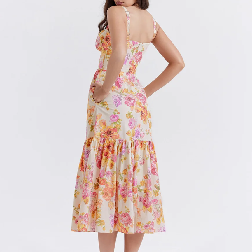 Effortless, yet sexy, this timeless Midi Dress features a tiered mid-length skirt, a bustier bodice, and a flattering open back. This dress offers a style perfect for any occasion, from romantic dinners to garden parties, with its softly gathered flattering fit. Style with gladiator sandals and a hobo bag or dress this style up with strappy sandals and a chic clutch.