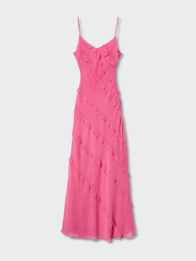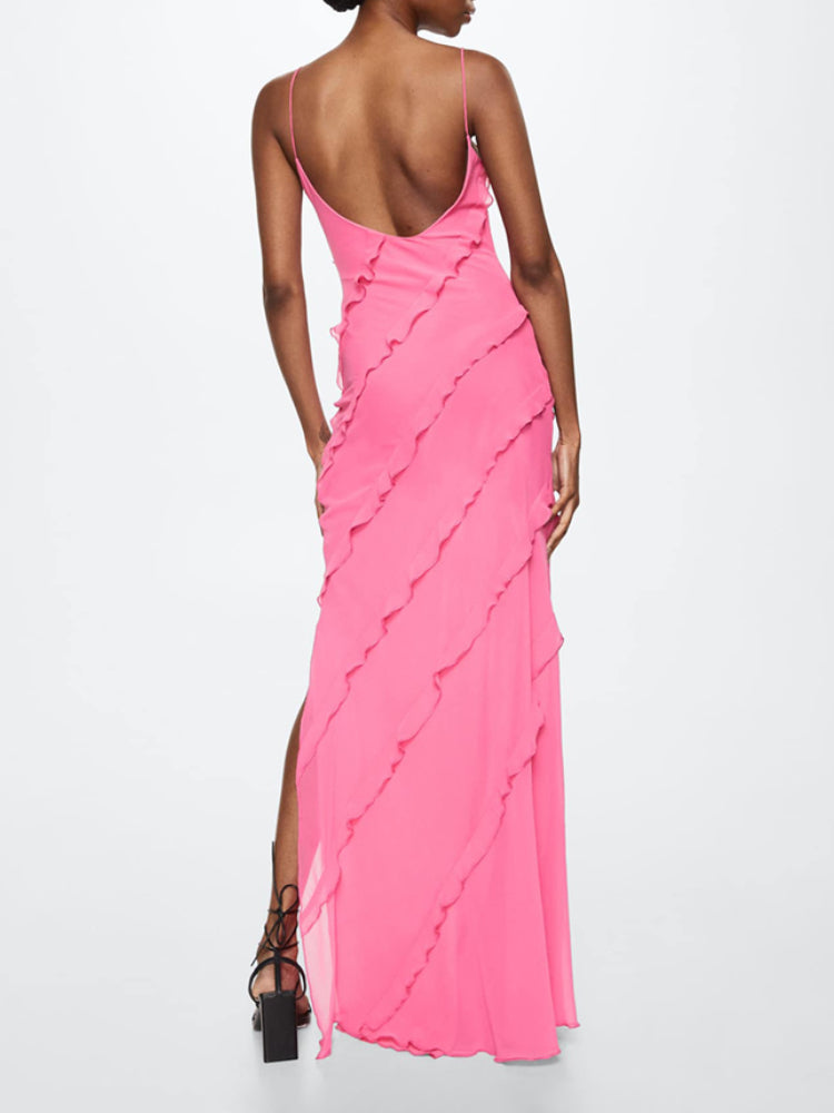 Pink Side Slit Backless Maxi Dress With Ruffle Detail