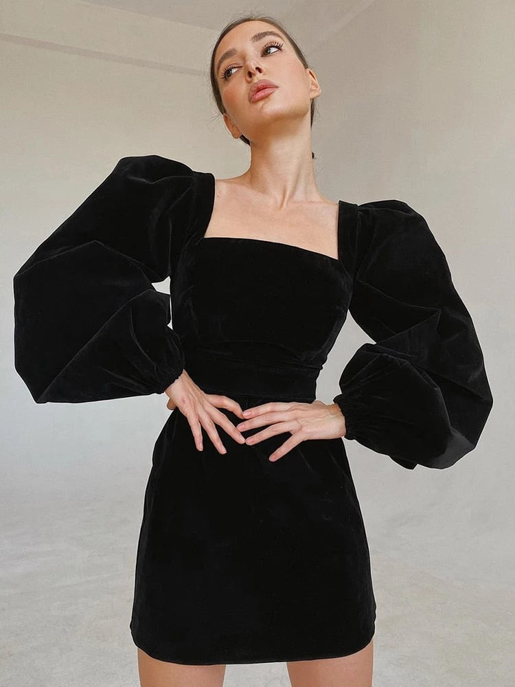 This velour mini dress is an all time favorite. It features puffy Balloon sleeves Ties at cuffs and a Square neckline.