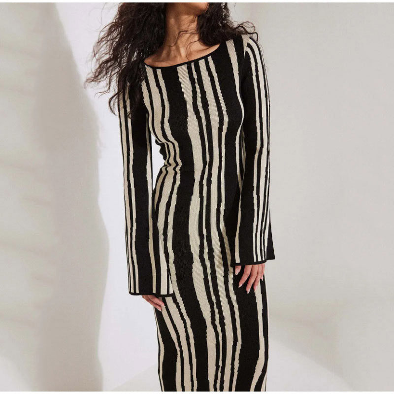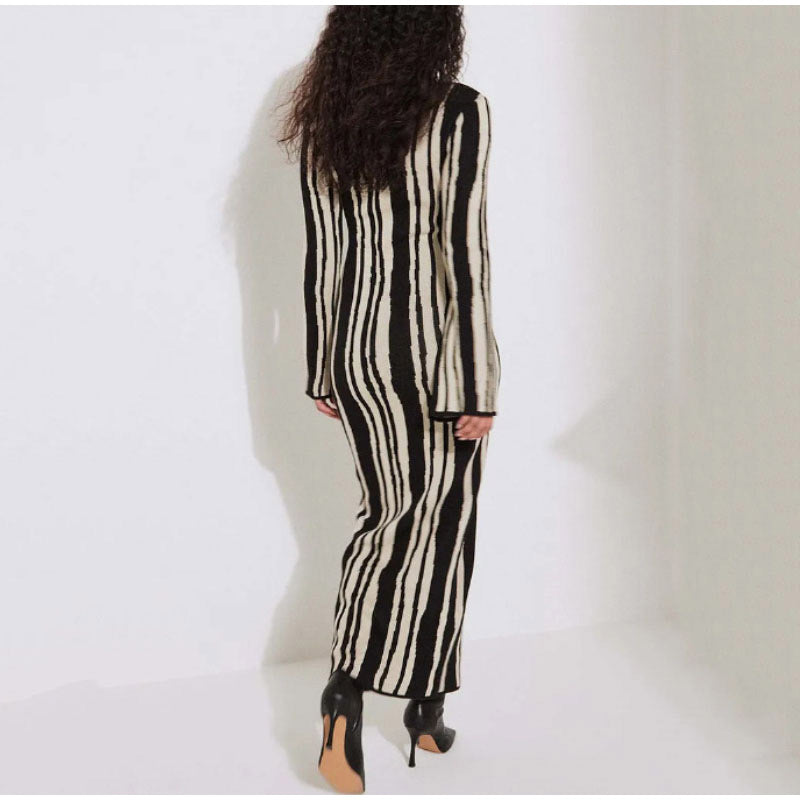 Stripped Knitted Flare Long Sleeve Maxi Dress