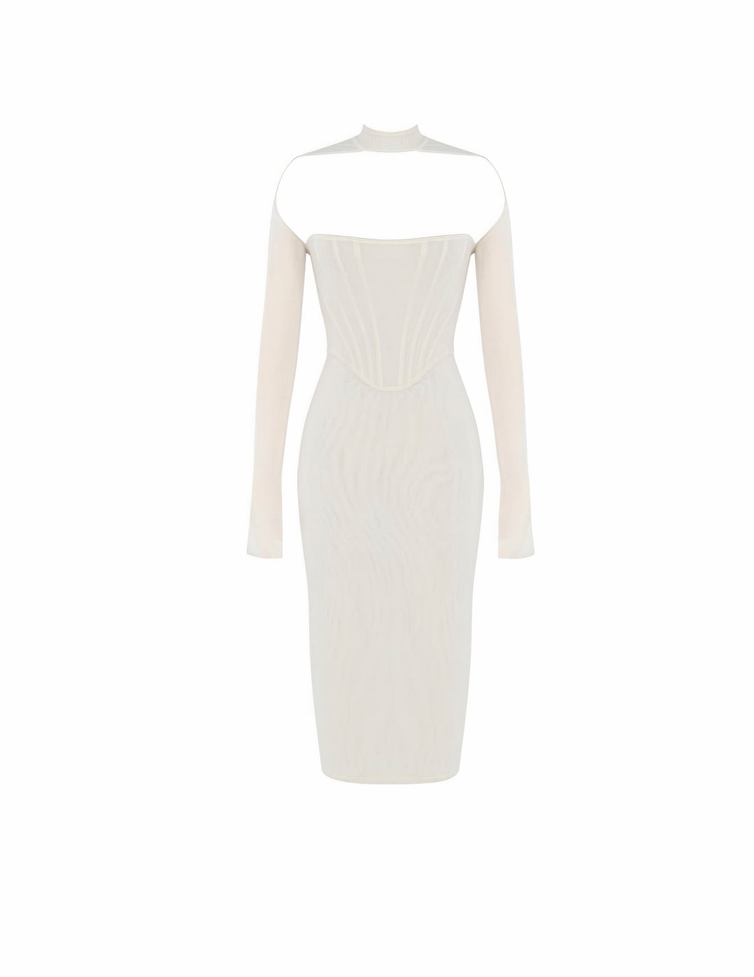 White Long Sleeve Mesh Corset Cocktail Midi Dress