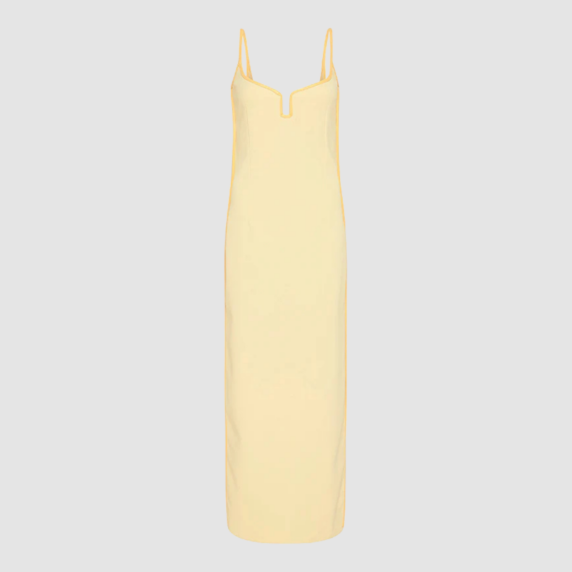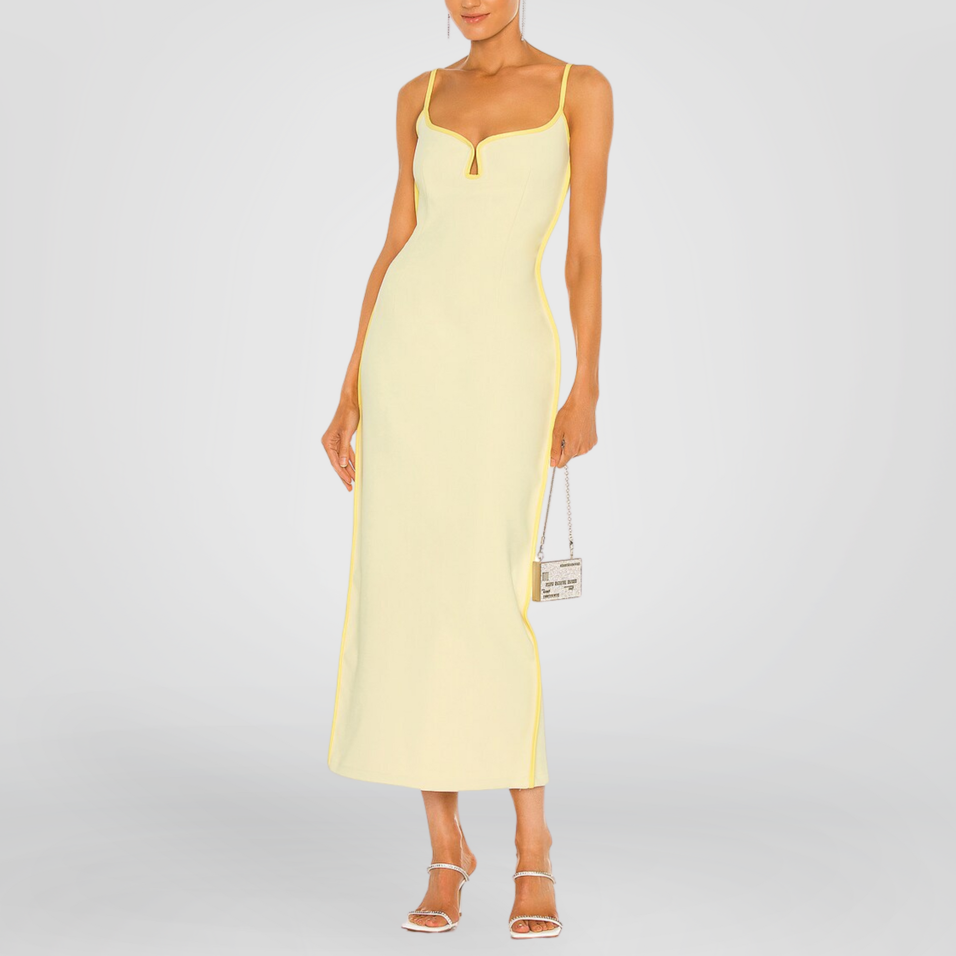 This midi dress is straight-up elegant vibes with the back slit for that lowkey drama, adjustable straps so it fits just right and hugs you in all the right places, and neon trim that edge. Whether you're out for brunch or running errands, this dress is the way to go every day.